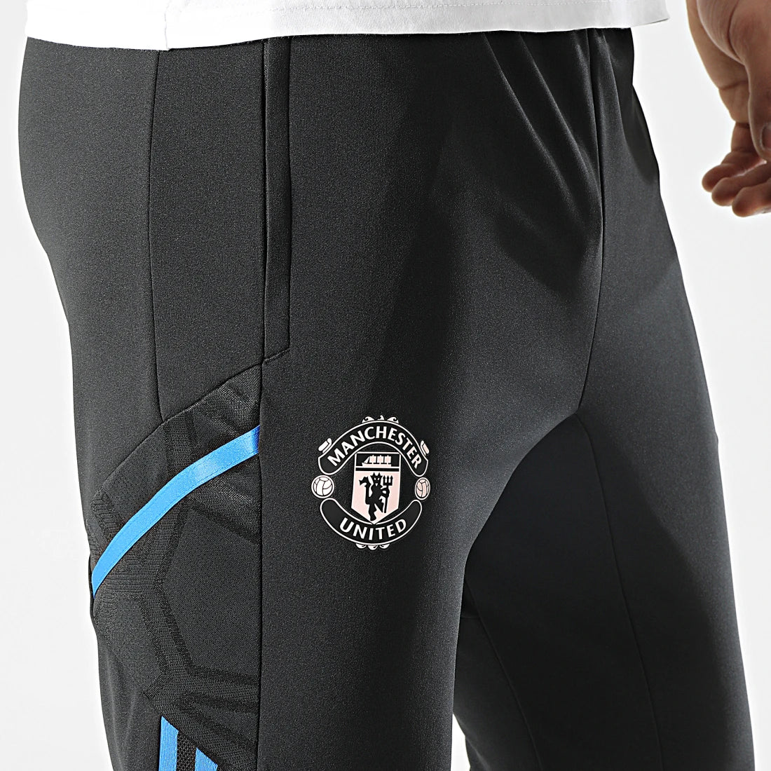 سروال تدريب مانيوستر يونايتد الأسود الأيقوني من أديداس ⚫🔴 تصميم أنيق نحيف مع خطوط زرقاء كهربائية جانبية 💙، شعار الشياطين الحمر مطرز بدقة على الفخذ ولوجو أديداس الملون يضيف لمسة عصرية ✨. قماش خفيف مريح وسريع الجفاف، خصر مطاطي برباط لثبات مثالي، وجيوب جانبية بسحاب للأمان 🏃♂️. مثالي للتمارين أو الإطلالات الكاجوال بطابع النادي الأسطوري! 🔥👖